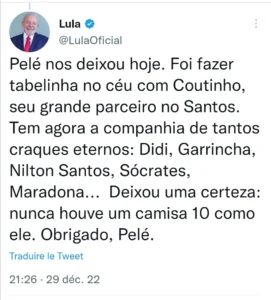 من جهته، ودع الرئيس البرازيلي المنتخب لويس إيناسيو لولا دا سيلفا أسطورة بلاده، قائلا على تويتر “لم يكن هناك رقم 10 مثله”.